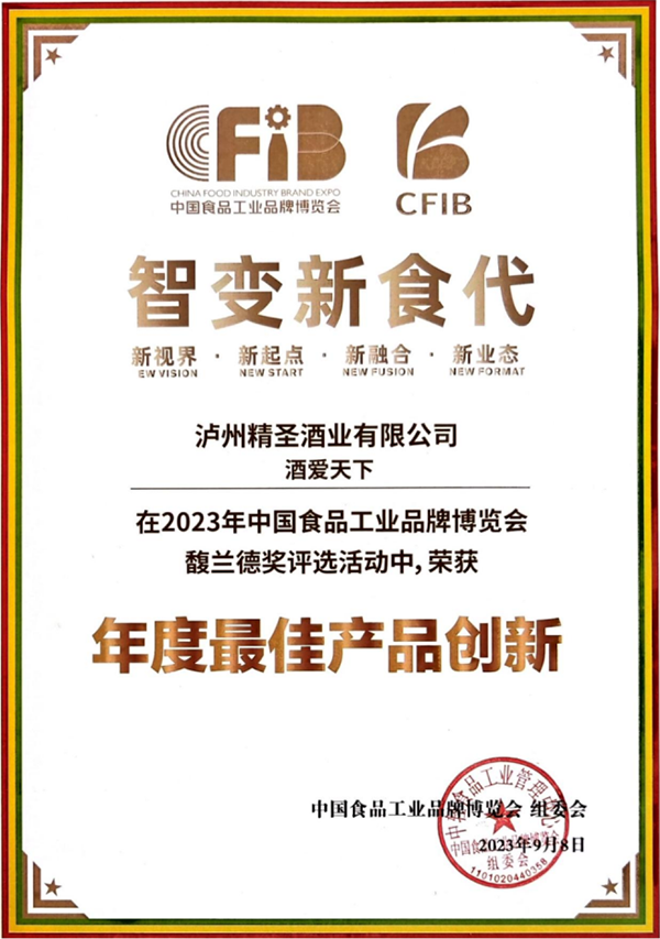 瀘州精圣酒業(yè)有限公司出品的“精圣”牌酒愛天下·禮品酒,具有諸香渾然添陳、內斂渾厚飽滿、韻味甘綿雅凈,聞著香、喝著順、飲后心曠神怡的內在品質,以及銀裝素雅剔透、生態(tài)玉白韻綠的外在裝潢,在此次展會中以其“蓋世酒仙、內外兼修”的產(chǎn)品魅力優(yōu)勢脫穎而出,獲得馥蘭德獎2023年度產(chǎn)品創(chuàng)新獎。